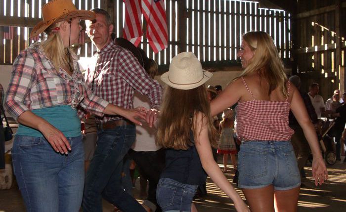 A Barn Dance, Ceilidh (pronounced "kay-lee") or Hoedown are similar in that the dancing involves people dancing together either as a couple or in various sized groups of couples. The dances are done in formations of couples in large or small circles, lines of 4, 5 or 6 people facing one another, squares of 4 couples of 2 facing 2, always for as many people who wish to join in.
